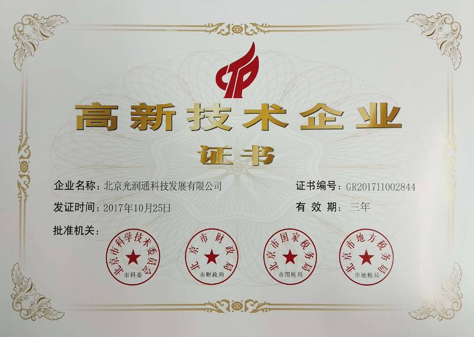 光潤通已通過高新技術企業證書認證。高新技術企業是指政府對持續進行研究開發與技術成果轉化,形成企業核心自主知識產權的企業的積極肯定,光潤通已成為國家需要重點扶持的高新技術企業。