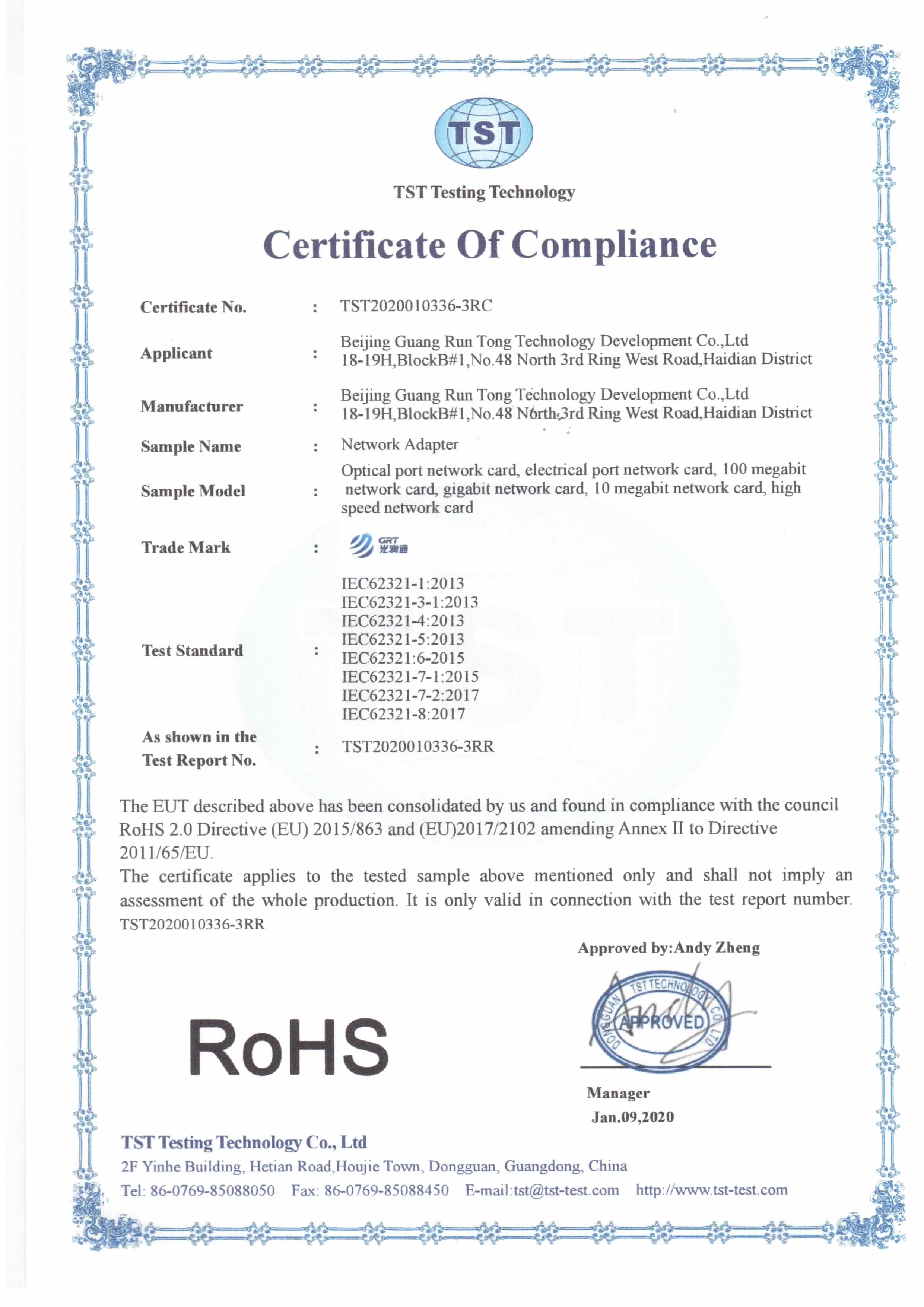 光潤通已通過RoHS認證。RoHS指令限制可能含有超過最高限量指標的鉛(Pb),鎘(Cd),汞(Hg),六價鉻(Cr), 多溴聯苯(PBBs)和多溴二苯醚(PBDEs)的電子、電氣產品,證明光潤通相關電子信息產品符合相關污染控制標準和技術規范。