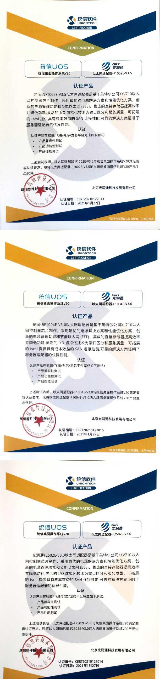 光潤通科技F1002E-V3.5、F1004E-V3.0、F2502E-V3.0三款產品在鯤鵬/飛騰/龍芯/兆芯平臺可穩定運行,安全可靠且性能高效。現光潤通科技已被納入統信服務器操作系統的V20生態伙伴,日后將攜手推進國產化新生態的發展。