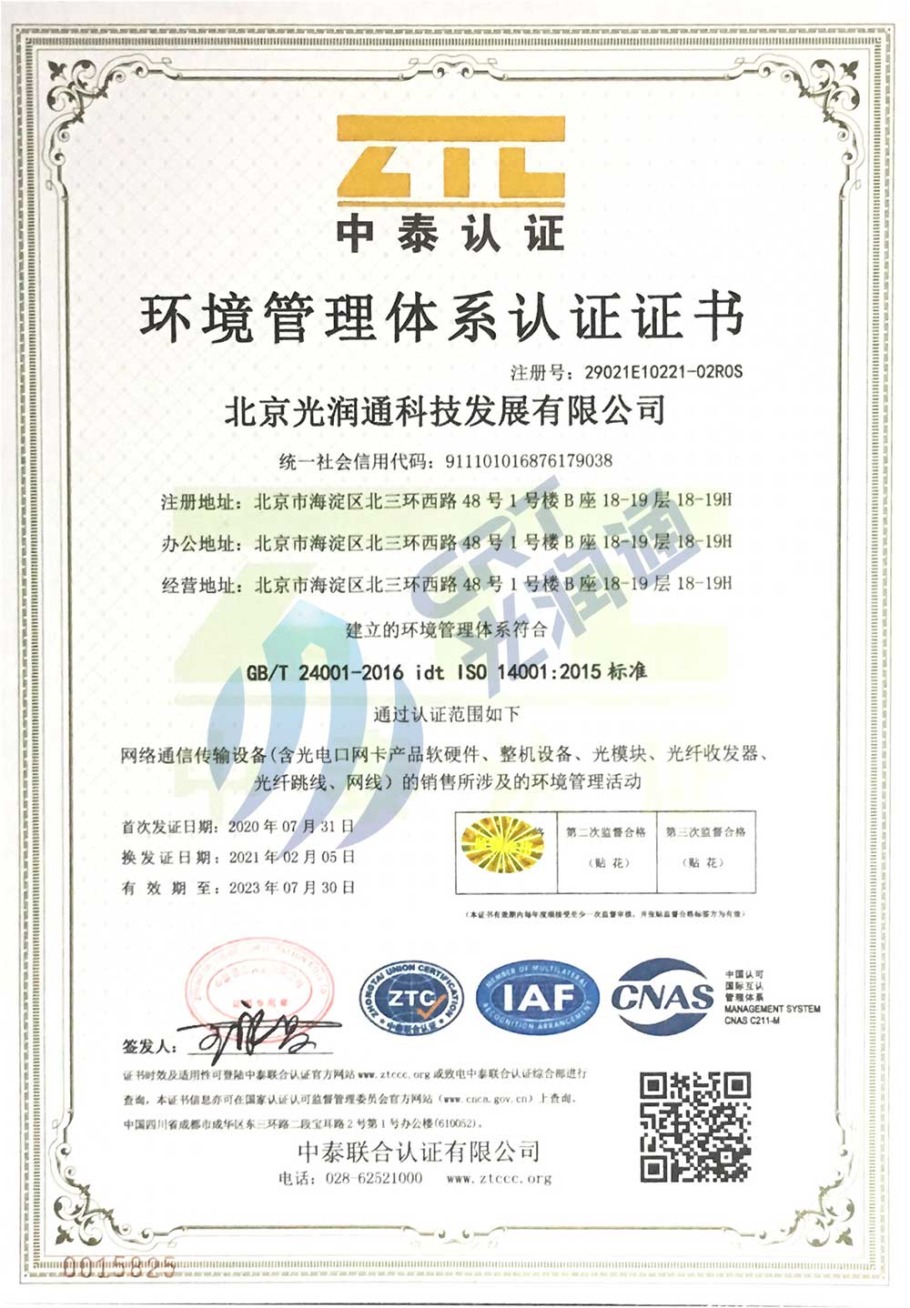 光潤通已通過ISO 14001認證。ISO14001標準以支持環境保護和預防污染為出發點,旨在為組織提供體系框架以協調環境保護與社會經濟需求之間的平衡,更好的幫助企業提高市場競爭力;加強管理,降低成本,減少環境責任事故。